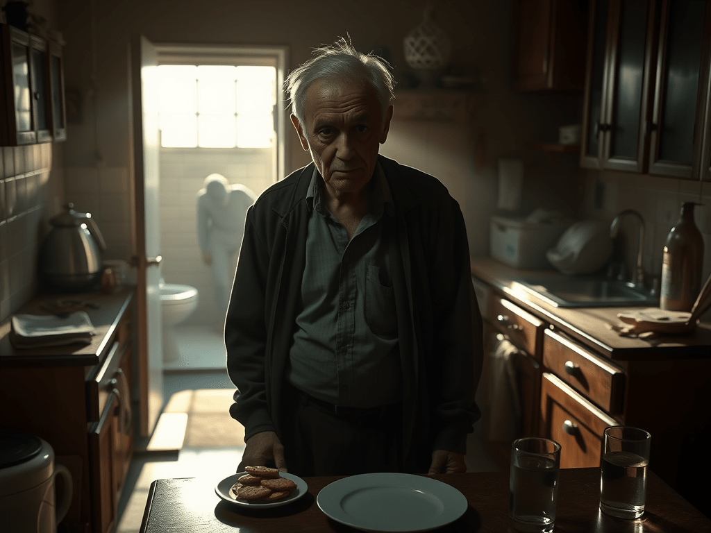 “What the hell is that smell?” You grab your cane and pull yourself up from the bed. It’s an effort and yet you finally managed, standing tall on your spindly legs. “Did I eat last night?”