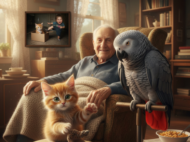 “Meow, I’m Tommy the kitten abandoned by an evil human family and now living with this wonderful human named Master Jerry. He’s really old and don’t walk very well, and his left arm and hand can’t pet me like the other one can.”