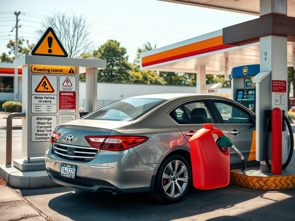 On my car there are similar instructions and was amazed that what my car instructed was in complete and total opposition to how this precaution on fuel islands. On my car it clearly shows that I am supposed to leave the fuel can inside the car’s trunk, a filling hose connected to the filler cap is supposed to connect to the portable fuel tank, and then you can begin filling said can.