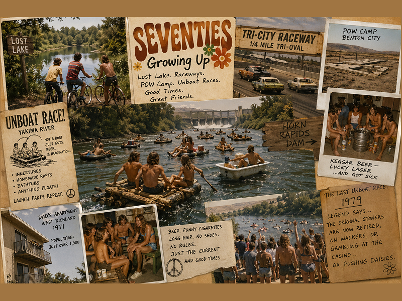 Oh, the seventies growing up, so much to do and a teenager like me enjoying every moment of it. There were the bicycle rides to Lost Lake, a shallow pond within an oasis of trees, mostly Alder and Russian Olive. Not far from there was the old Tri-City Raceway, a quarter mile tri-oval track for wannabe stock car drivers. Outside Benton City was the POW camp, now just a dozen or so cement slabs where German prisoners of war were housed, and where me and my friends went to learn how to drink keggar beer, most likely Lucky Lager, and got sick.